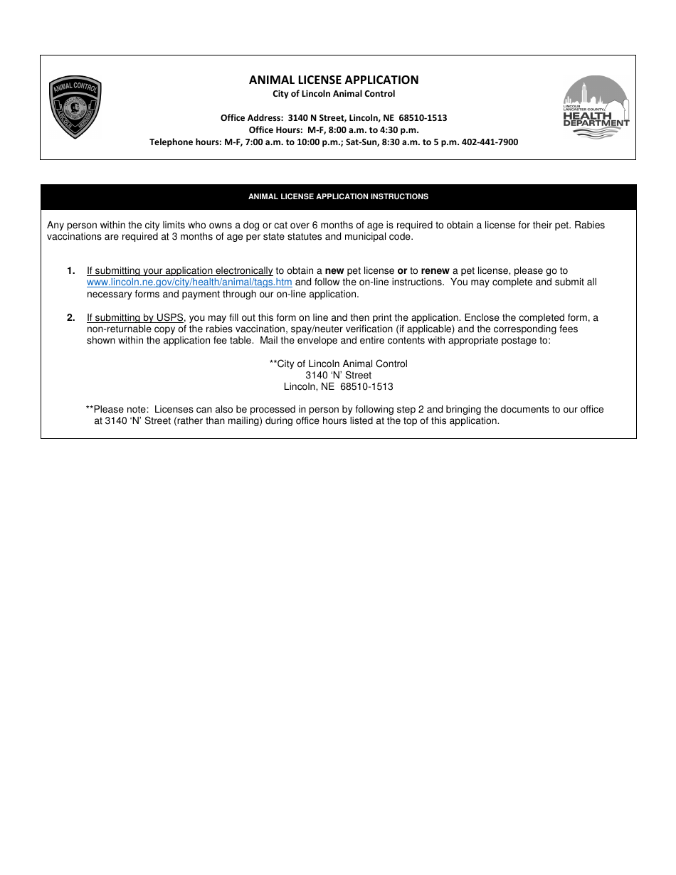 City of Lincoln, Nebraska Animal License Application Form Fill Out