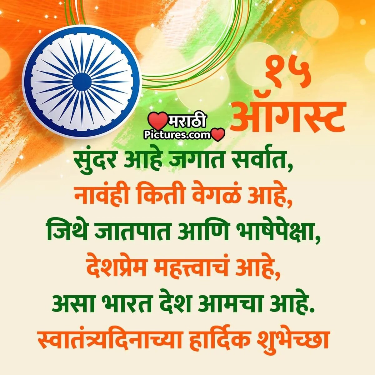 75th Independence Day Wishes and Message, Status in Marathi with Images Independence Day Quotes Marathi Happy independence day in marathi. Independence day thought in marathi. Independence day quotes in marathi. 15 ऑगस्ट 1947 या दिवशी इंग्रजांनी भारत सोडला आणि. Independence day quotes in marathi. स्वातंत्र्य प्रत्येकासाठी आहे त्यास रंग किंवा आकार नाही देशातील द्वेष आणि हिंसाचार नष्ट करून प्रेम आणि समजूतदारपणाने आपले उज्ज्वल भविष्य घडवण्याची आवश्यकता आहे. स्वातंत्र्य दिन मराठी स्टेटस (independence day status in. Independence Day Quotes Marathi.