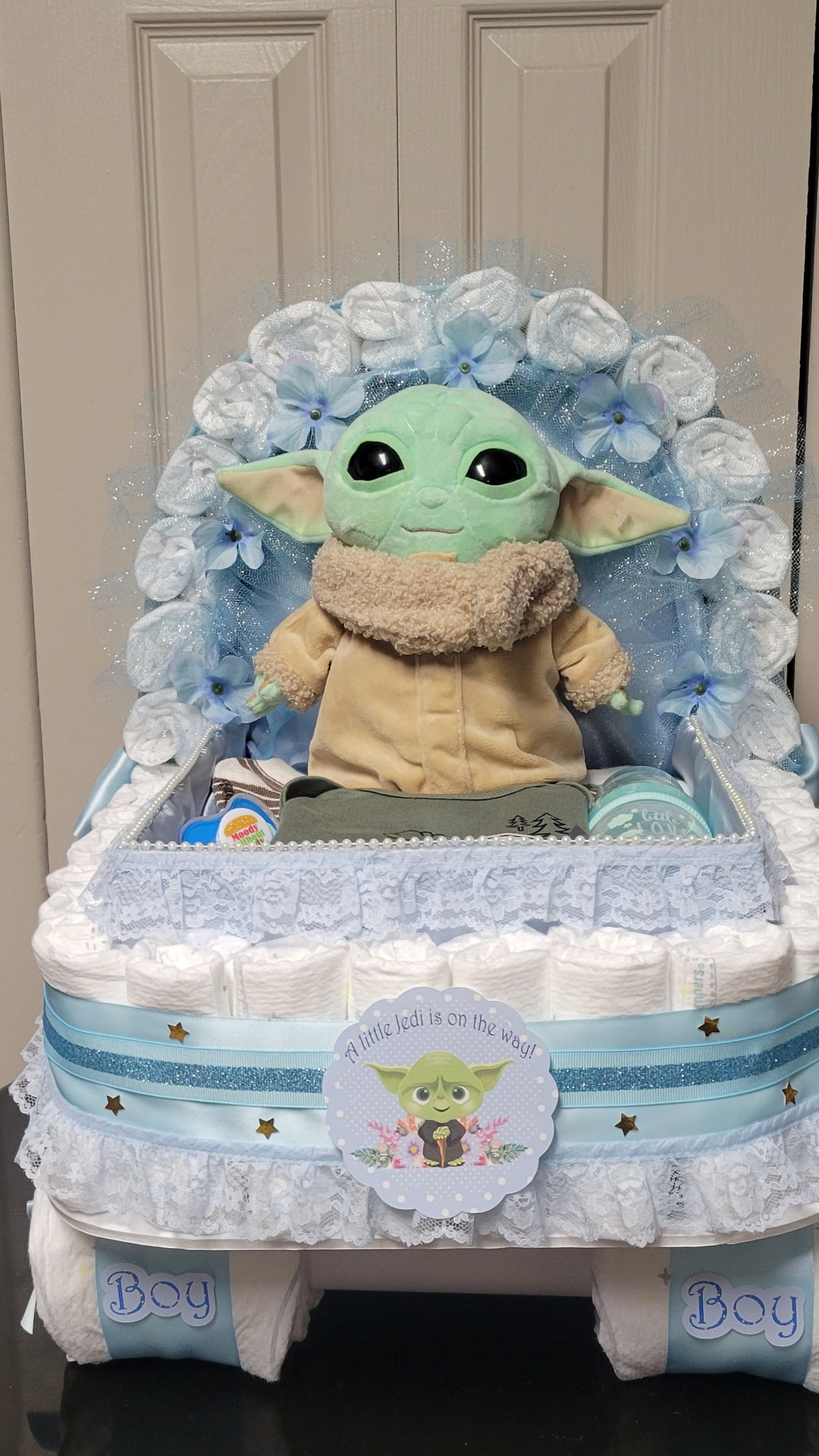 Baby Yoda Diaper Cake Star Wars Baby Shower Its a Boy Etsy Diaper Cake Baby Yoda Premium 4 tier baby yoda star wars diaper cake with plush yoda, brush/comb, pacifiers, washcloths, custom signs and cake topper. Create a star wars themed baby shower complete with diy entrance sign, diy moon vase place cards, and an adorable diy baby yoda diaper cake! Diaper cakes are one of the cutest additions to any baby shower. What a beautiful. Diaper Cake Baby Yoda.