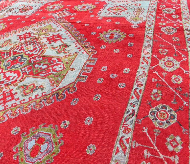 Antique Oushak Rug with Beautiful Red, Acid Green and Icy Blue For Sale