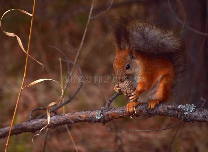 Squirrel Eating Pine Cone on Tree Branch in Autumn Forest Stock Photo