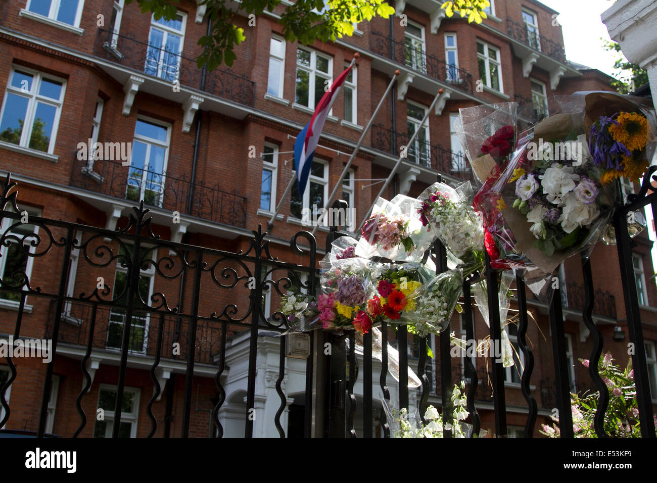 London UK. 19th July 2014. Floral tributes are placed outside the Dutch