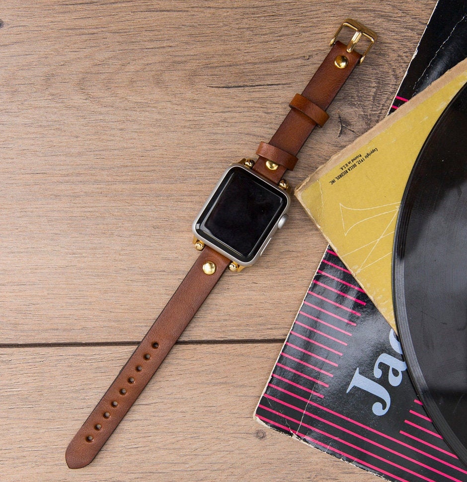 Slim Leather Apple Watch Band Women Light Brown Gold Apple Etsy