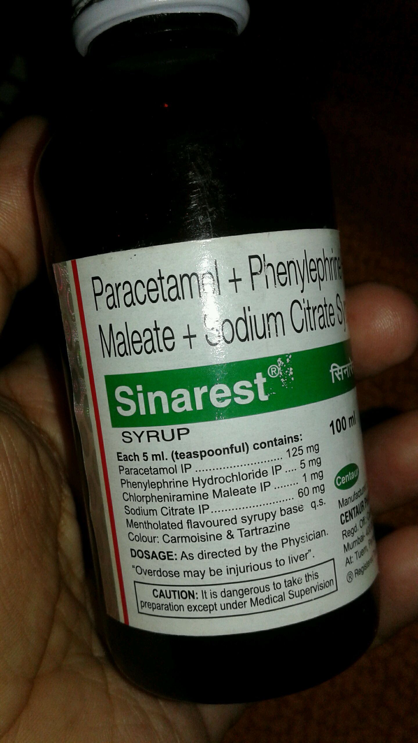 Sinarest Syrup Images This medicine is not recommended for use in children less than 2 years of age. Sinarest syrup is used for common cold symptoms etc. Sinarest syrup is a combination medicine used for the treatment of common cold and cough associated with fever. Sinarest syrup is a fixed dose combination of paracetamol 125 mg, phenylephrine hydrochloride 5 mg, chlorpheniramine maleate 1. Sinarest Syrup Images.