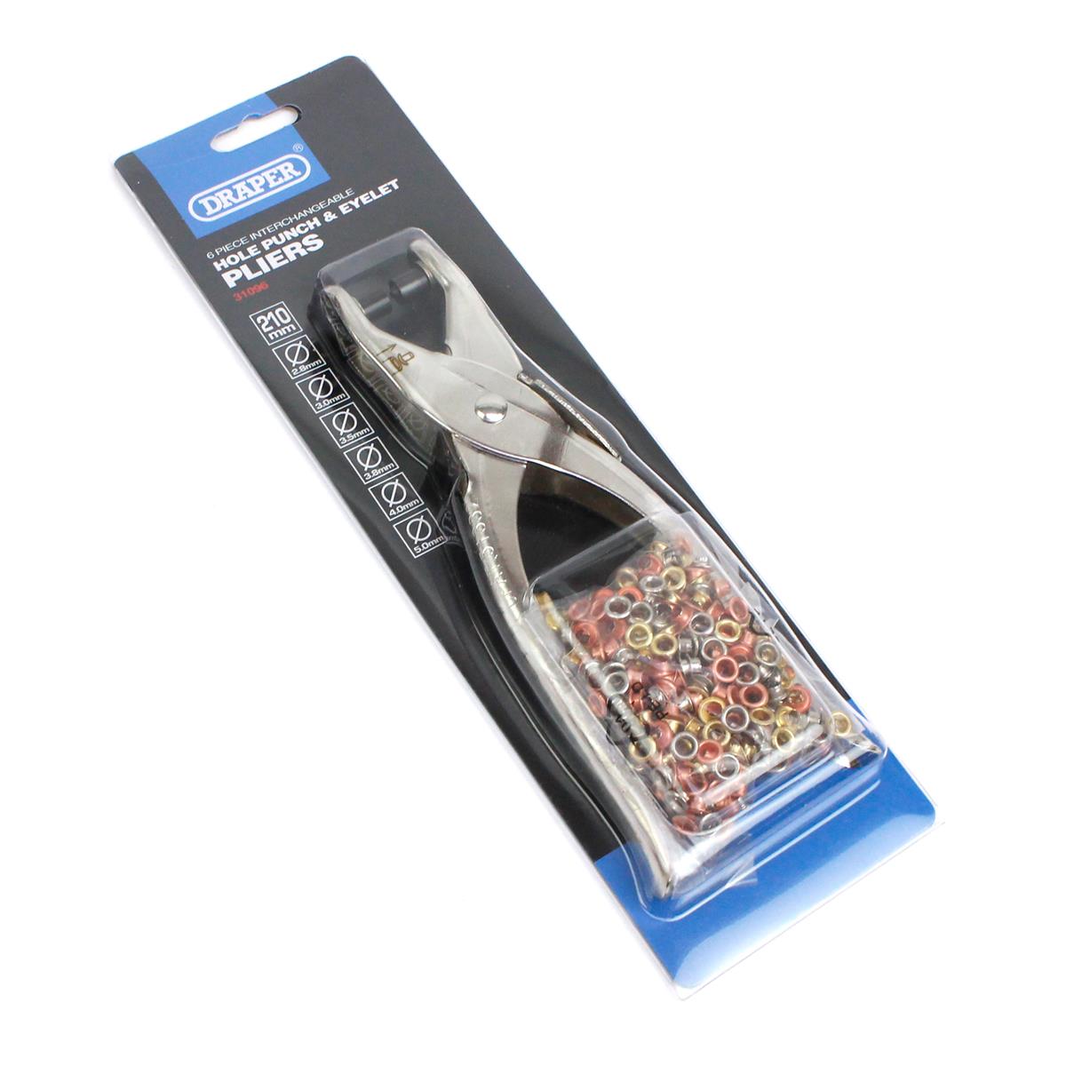 Interchangeable Hole Punch and Eyelet Pliers, 210mm (31096) Draper Tools Draper Hole Punch & Eyelet Kit this handy tool can be used as a conventional hole punch (supplied with a quantity of 4mm eyelets) on soft. This handy tool can be used as a conventional hole punch (supplied with a quantity of 4mm eyelets) on soft materials, or to join. Free click & collect on this product or free standard home delivery when you. Kit. Draper Hole Punch & Eyelet Kit.