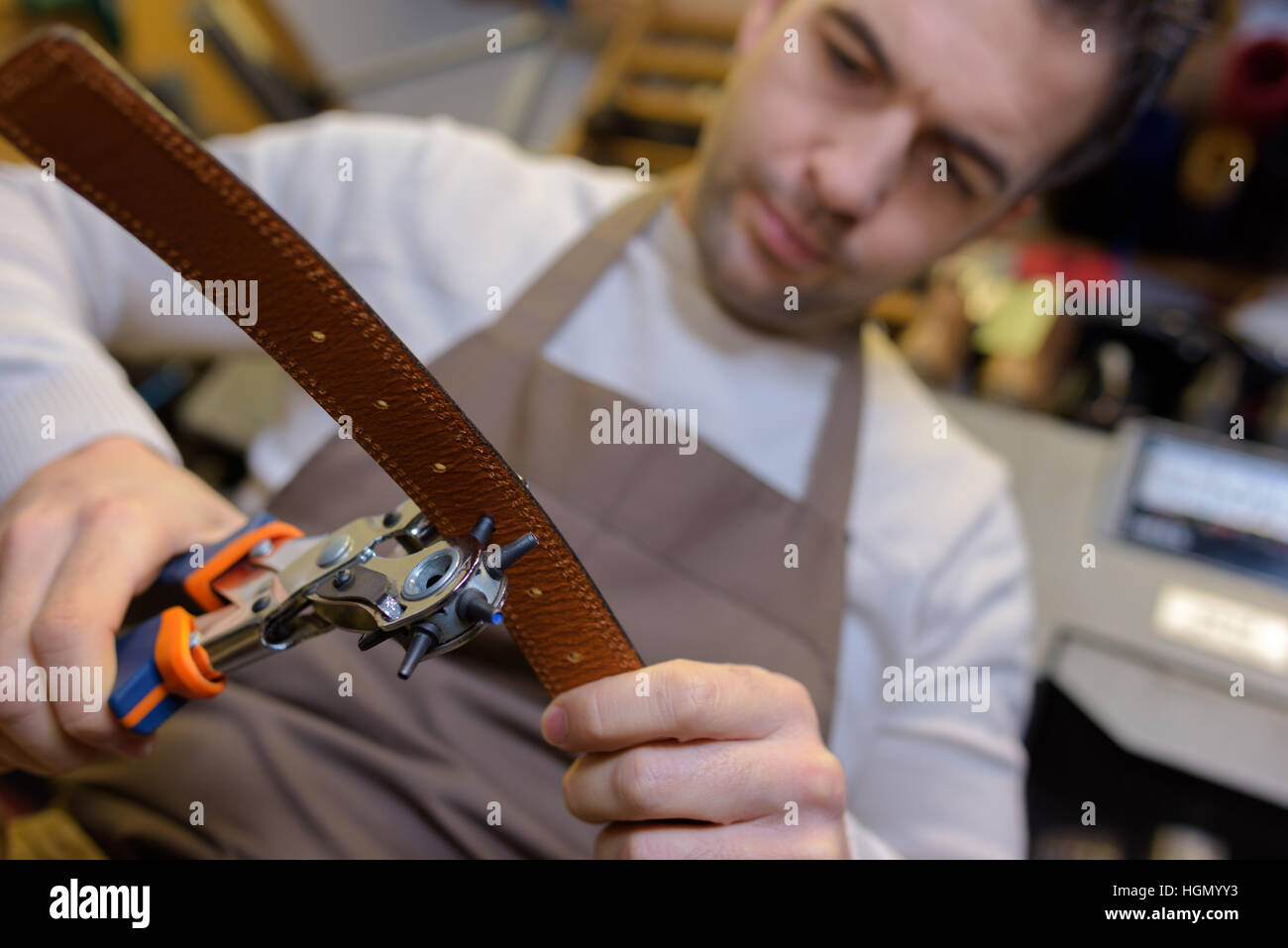 Man punching hole in leather belt Stock Photo Alamy