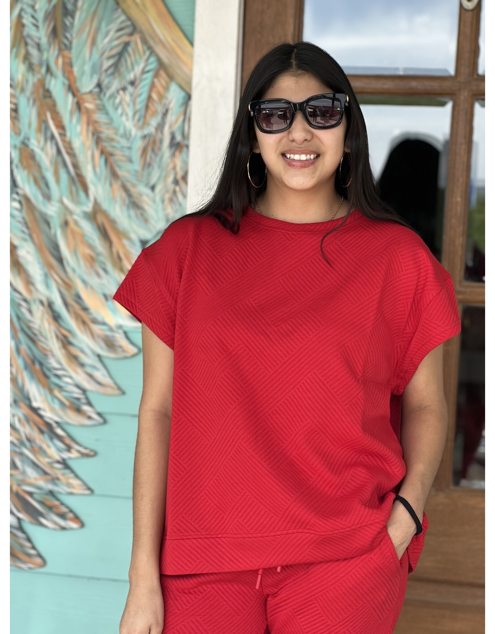 Red Textured Short Sleeve Top Rhinestone Angel