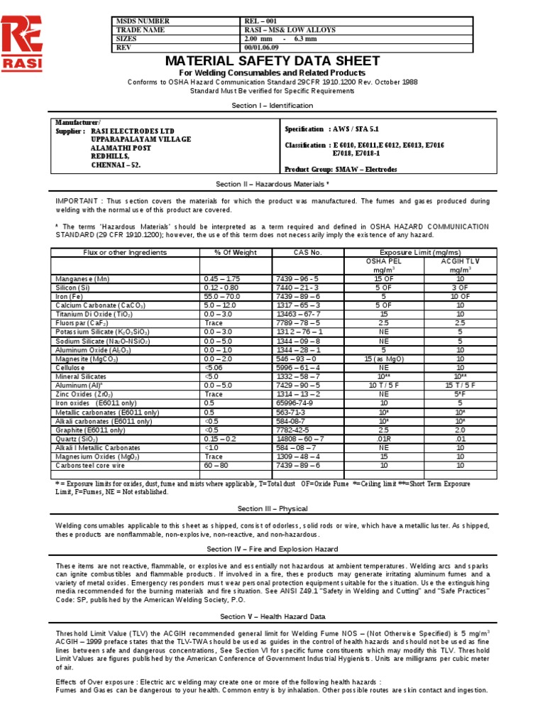 (PDF) MATERIAL SAFETY DATA SHEET Central Welding … · MATERIAL SAFETY Welding Safety Data Sheets Access material safety data sheets (msds) at specialised welding products, prioritizing safety and compliance. Ask for your employer’s safety practices which should be based on manufacturer’s hazard data. The product must be handled in accordance with good industrial hygiene and safety procedures. Avoid breathing welding fumes and gases; They may dangerous to your health. Product stewardship declarations and safety documents.. Welding Safety Data Sheets.