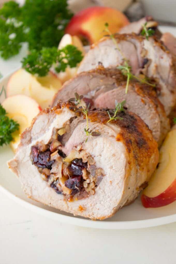 Pork Tenderloin Stuffed Apples . pork tenderloin is wrapped around a sweet and savory filling made from apples, onions, bacon and herbs, roasted, then smothered in an. Remove the meat and add the cream. The stuffing ingredients are classic for the holiday season—apple, walnuts, cranberries, breadcrumbs, shallots, maple syrup, and rosemary—and work wonderfully with the roast. add the chicken broth, tarragon and apples. Bake for about 20 minutes. Riesling, or other sweet white wine. the best stuffing for pork loin. Drizzle them over the cut roast slices, or use them to make gravy. When the roast is done, make sure to save any pan drippings! 1/2 cup coarsely chopped mixed dried fruit, such as golden. Garnish with extra sliced apple and fresh parsley for a special dish when unexpected guests drop in.