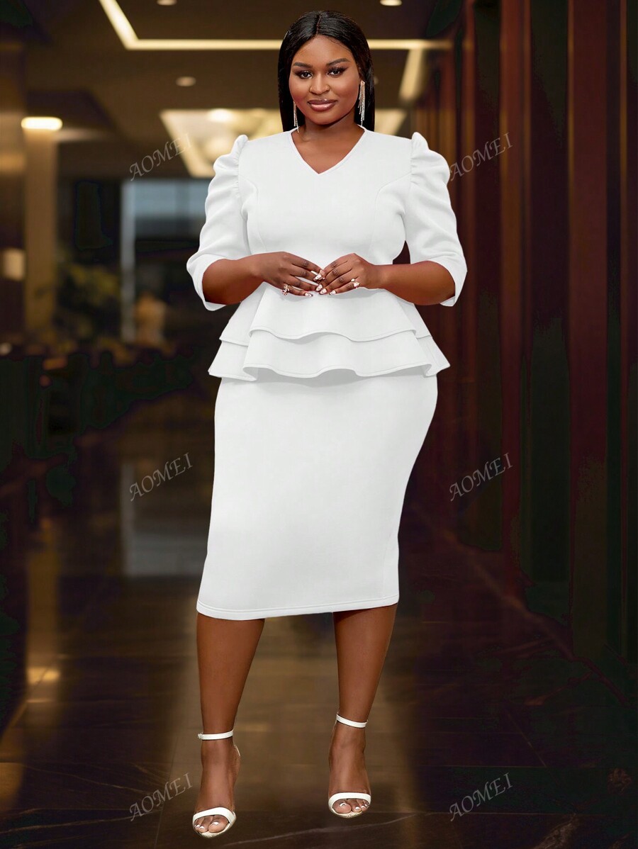 Plus Size Solid Color VNeck Mid Sleeve Top And FormFitting Dress Set