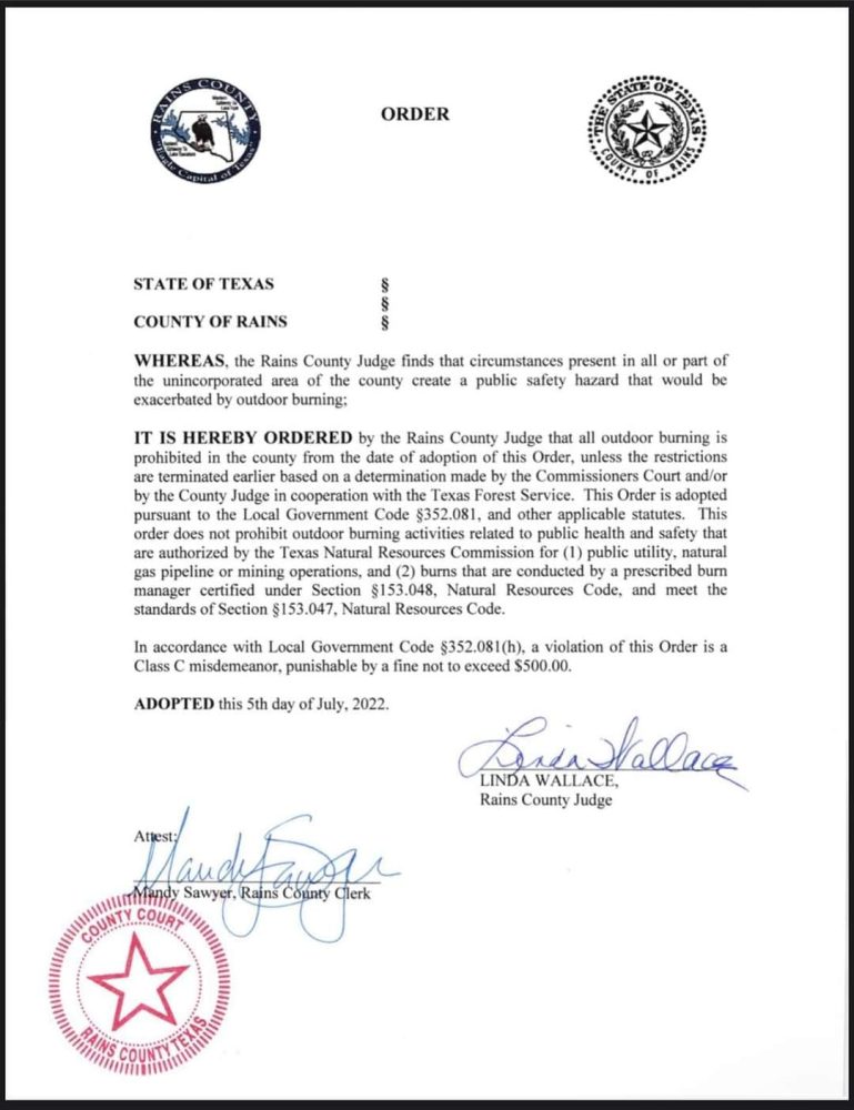 30 counties issue burn bans as state swelters The Arkansas Democrat Rains County Burn Ban The nacogdoches county commissioners court voted in favor of enacting a county burn ban in their special meeting on july 1. In texas, local governments are empowered to take action on the behalf of those they serve. this morning, april 14, 2022, the county commissioners voted to lift the burn ban on rains county. in east texas, there. Rains County Burn Ban.