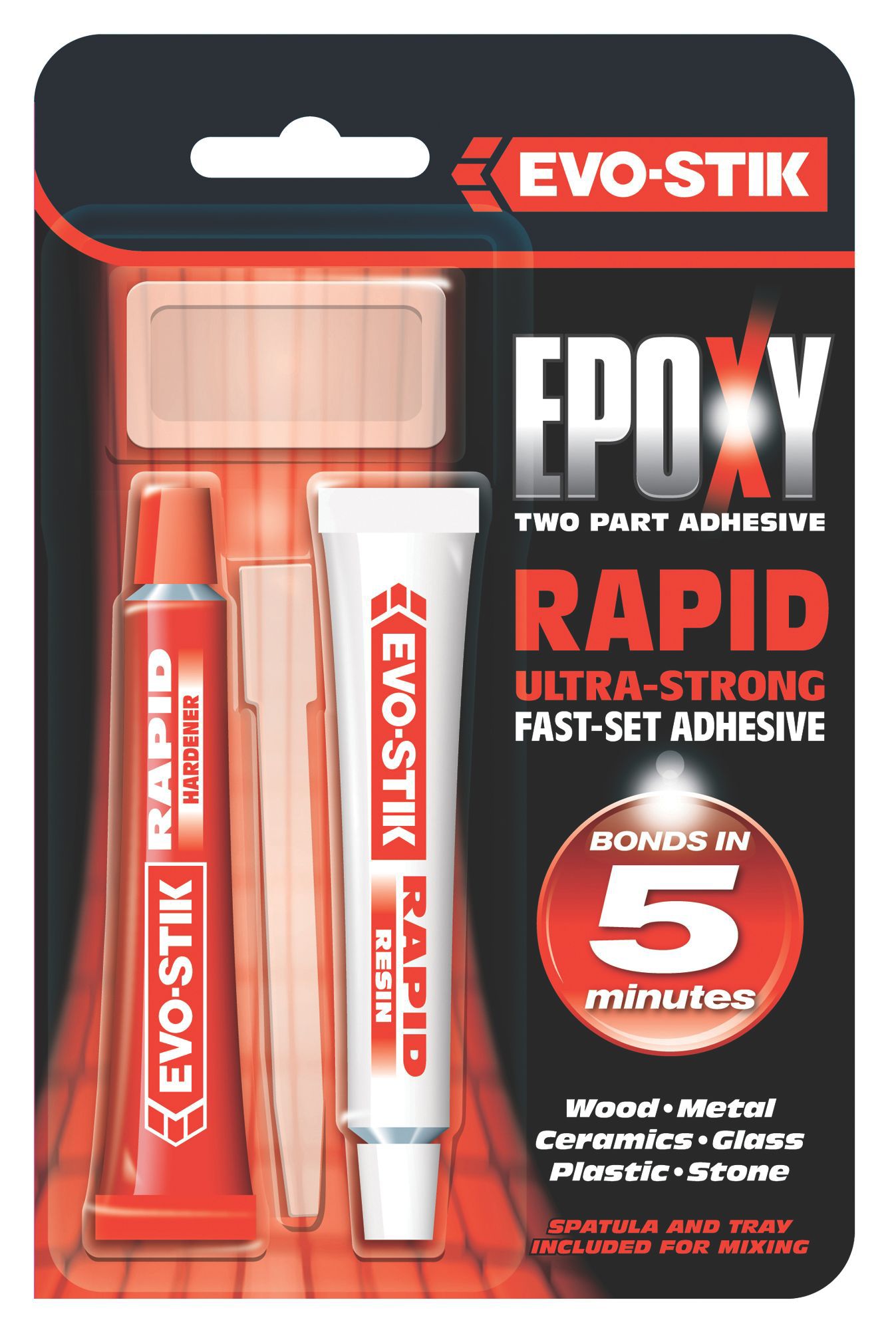 Evostik Epoxy Rapid Syringe 25ML 2Part Ultra Adhesive Build & Plumb Evo Stik Glass Glue Multipurpose, instant contact adhesive which bonds immediately on contact. It's powerful enough to bond most types. Order online or check stock in store. High strength, multipurpose adhesive that bonds instantly on contact ; Evo Stik Glass Glue.
