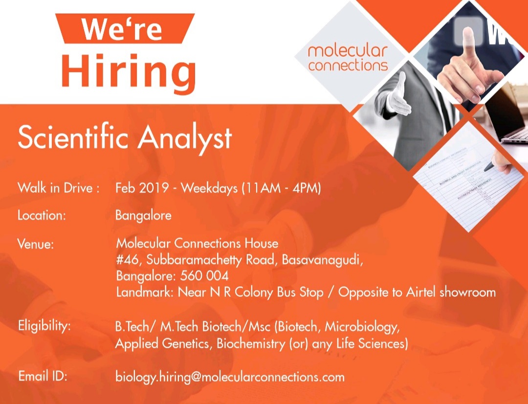 Molecular connections hiring scientific analystBangalore Feb 2019
