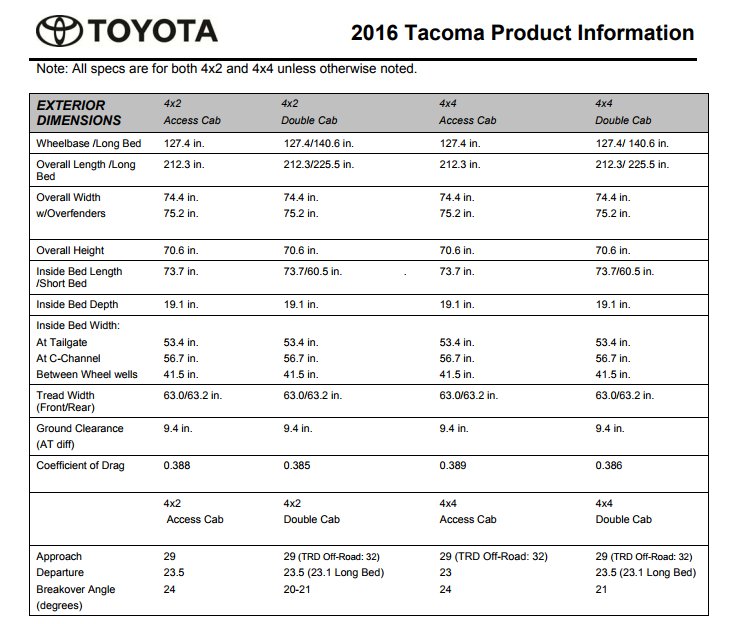 The bed side caps also are different dimensions, 2nd gen is straighter up and down. The height is going to vary between 2nd and 3rd gen. All tacomas from 2005 to the present share the same bed sizes. The bed dimensions for a 2nd gen tacoma are typically 60.5 inches wide by 73.5 inches long for the long bed, and 60.5 inches by. Remember there are 2 lengths, short bed (a bit over 5') & long bed (about. 74.5long/57.9wide/40.9high.anybody out there have 2nd gens figures to compare? Below we'll list the dimensions for this pickup from. I also believe 2nd and 3rd gen tacos have the same composite bed. This drawing is specifically for a 2016 toyota tacoma trd sport access cab long bed. I believe the specs are the same for the 5ft bed as well (width, height ect), given there is 12 taken from the front of the bed.