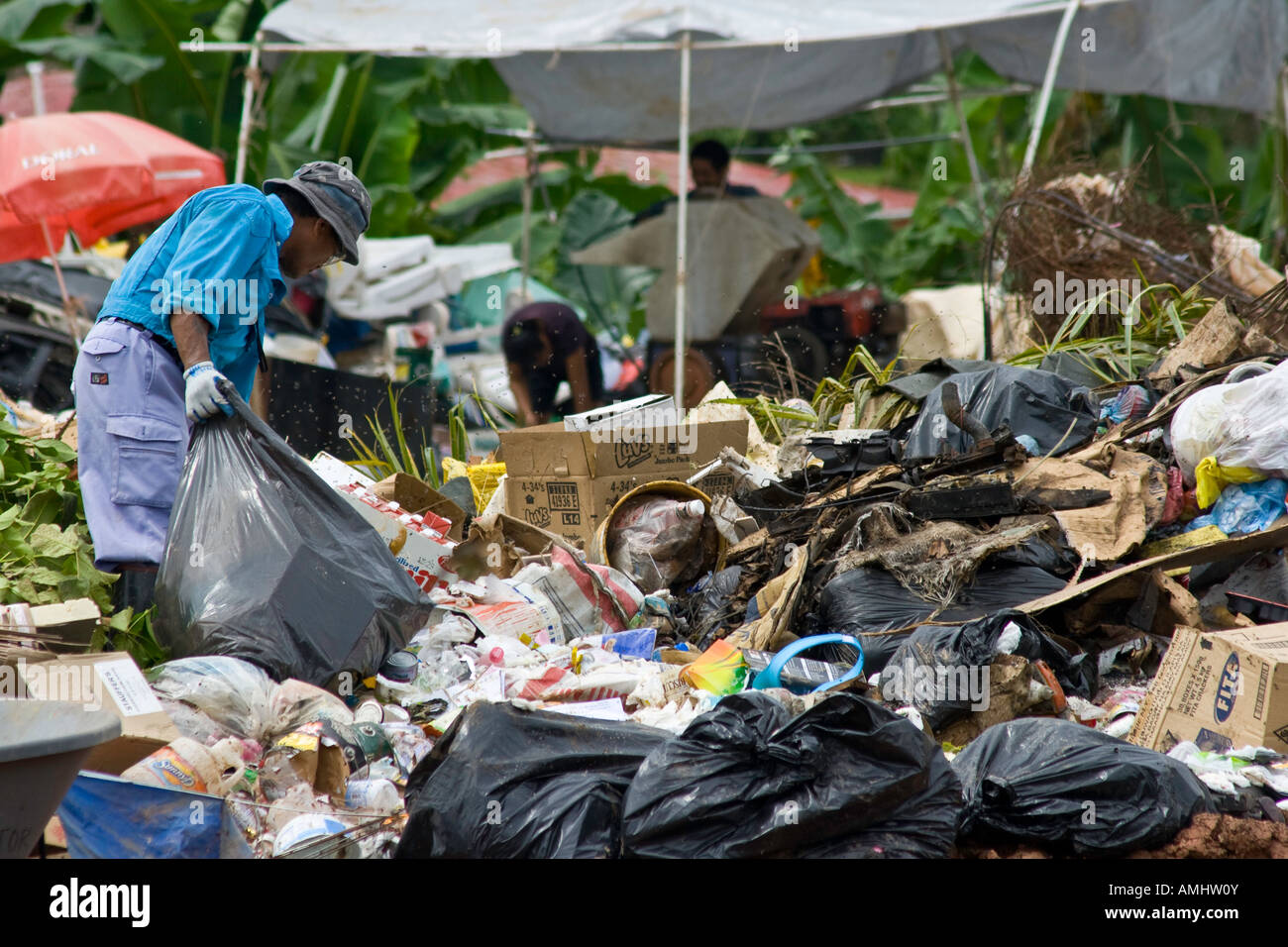 Poor Man Scavanging through a Garbage Dump on Palau Island Stock Photo