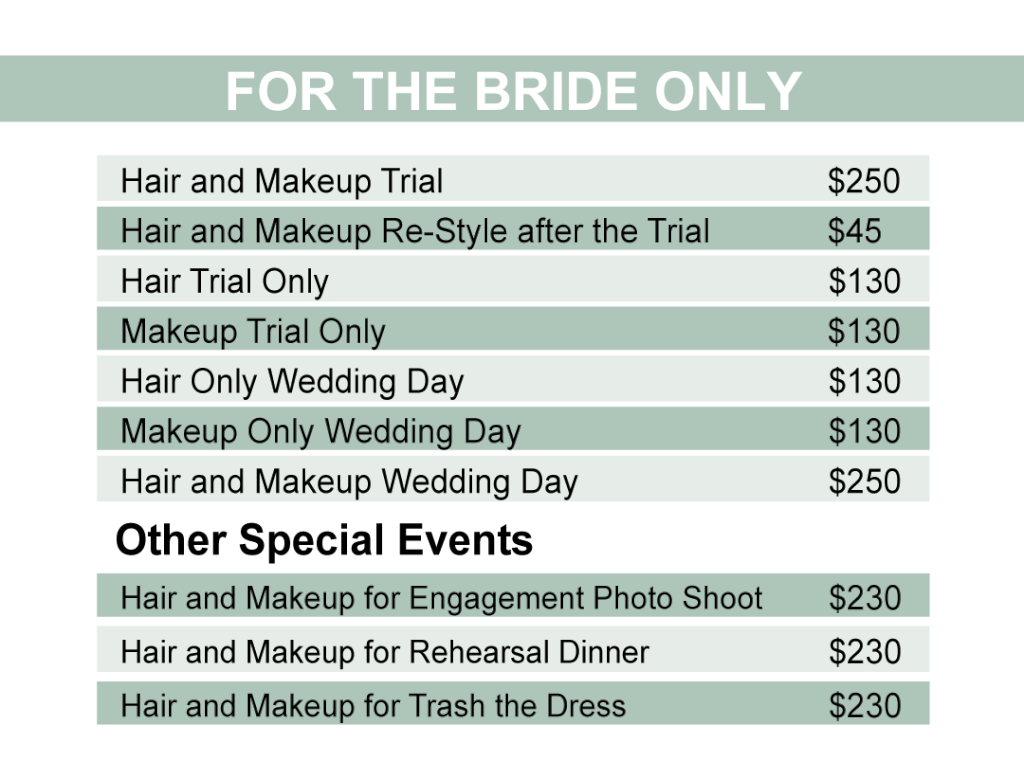 Wedding Hair Stylist Pricing Guide, Canva Template, Makeup Price Sheet Hair And Makeup Wedding Prices Costs for bridal hair and makeup can range anywhere from $250 to $1000 for your bridal hair and makeup services. We have a bridal hair and makeup packages for whatever your wedding party size and work on beautiful uk and destination weddings. However, the total bill varies. The average cost of wedding hair is $100 to $350, according to bridal. Hair And Makeup Wedding Prices.