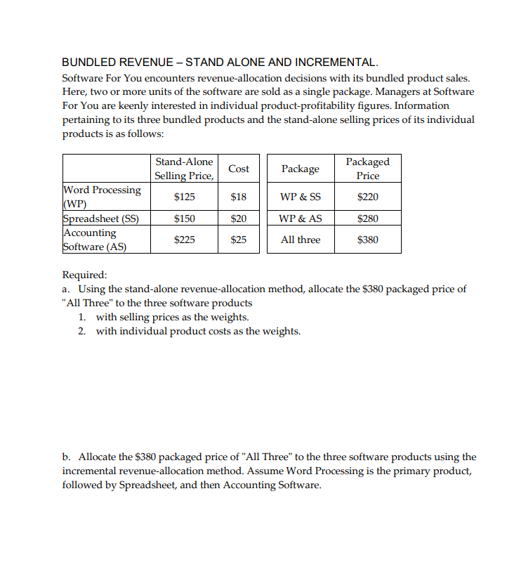 Solved BUNDLED REVENUE STAND ALONE AND INCREMENTAL.