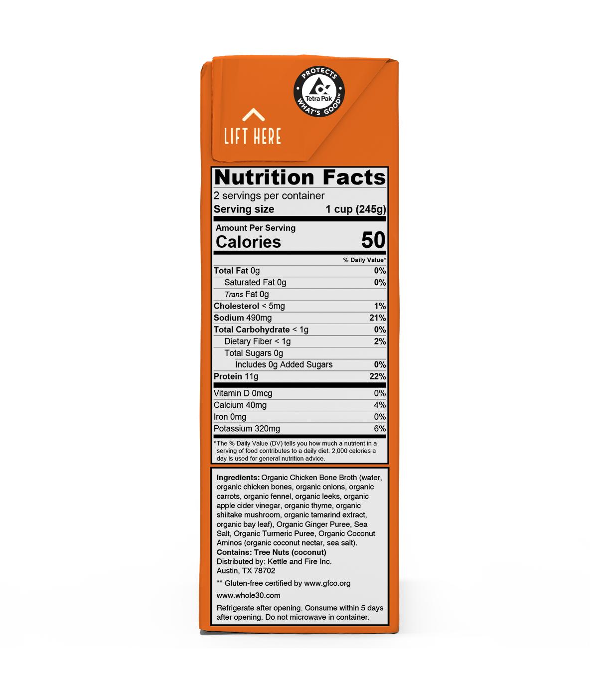 Kettle & Fire Bone Broth Chicken, 16.2 FL OZ Kettle And Fire Ginger Turmeric Bone Broth Our organic chicken bone broth is simmered with organic ginger, organic coconut aminos, and organic turmeric for an aromatic, flavorful. Easy to drink daily or to mix with your favorite bone. With organic vegetables for 20+ hours to get the maximum amount of collagen, proteins and amino acids into our tasty bone broth. Incredibly delicious bone broth with collagen: Bold. Kettle And Fire Ginger Turmeric Bone Broth.