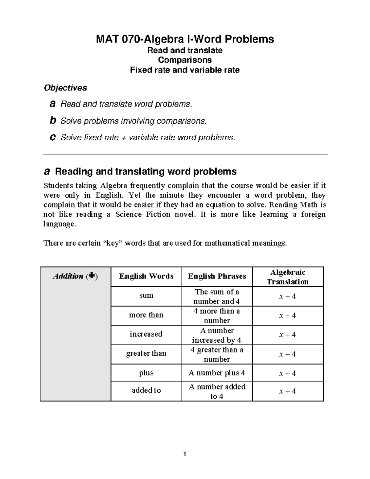 MAT 070 Word ProbsIntro 1 MAT 070Algebra IWord Problems Read and