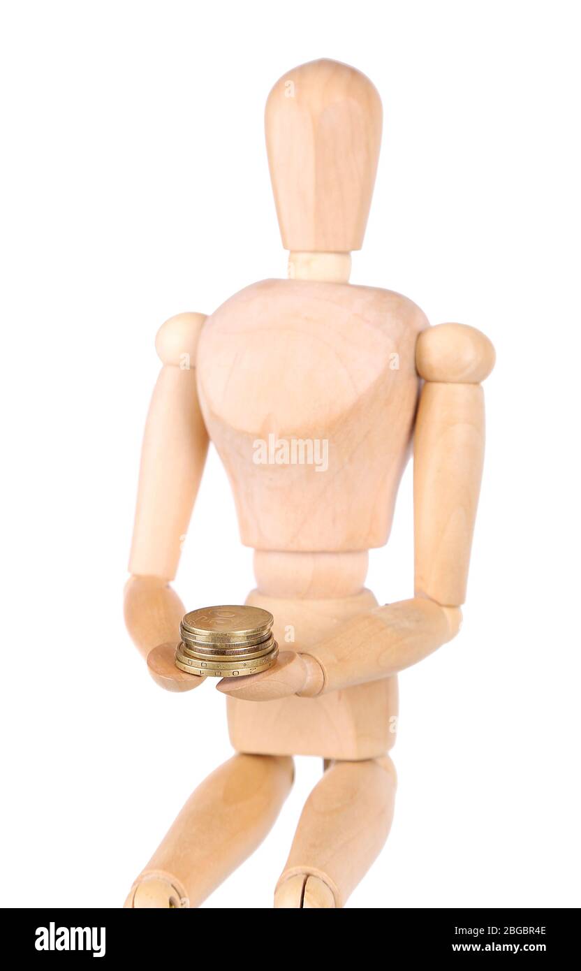 Wooden small mannequin with money isolated on white Stock Photo Alamy