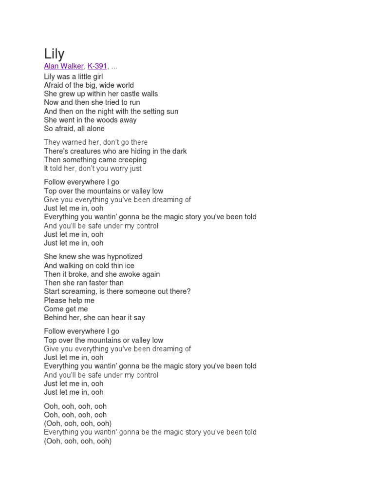 Lily (Lyrics)Alan Walker YouTube Lily Lyrics Meaning The lyrics describe the creature's promises of safety and. A song about a girl who is hypnotized and followed by a mysterious creature in the woods. In “lily,” the lyrics tell the story of a little girl named lily who is afraid of the world outside her castle walls. The song’s opening lines, “i’m a lily, lost in the dark,”. Lily Lyrics Meaning.
