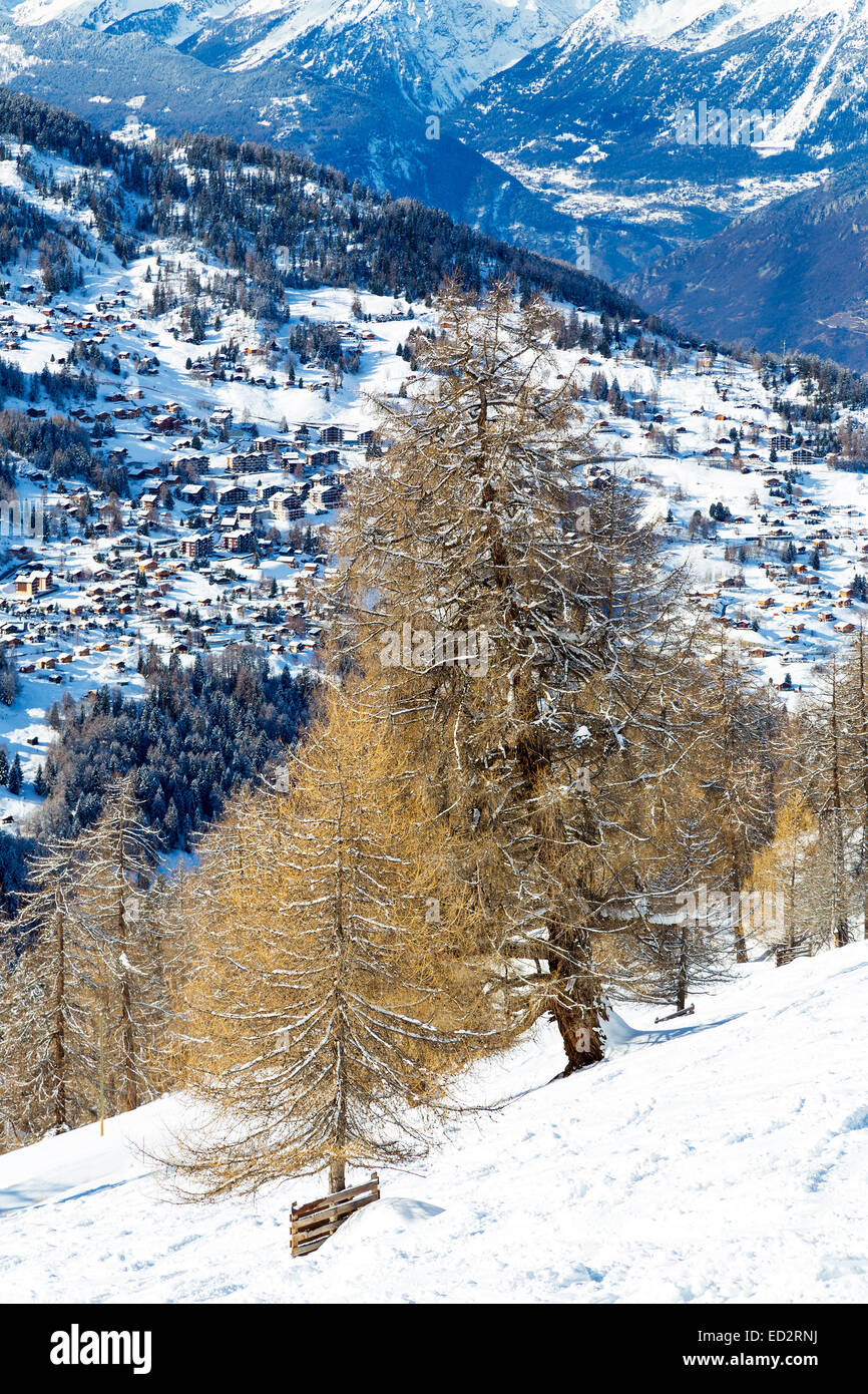 Larch on the background of a mountain village Stock Photo Alamy