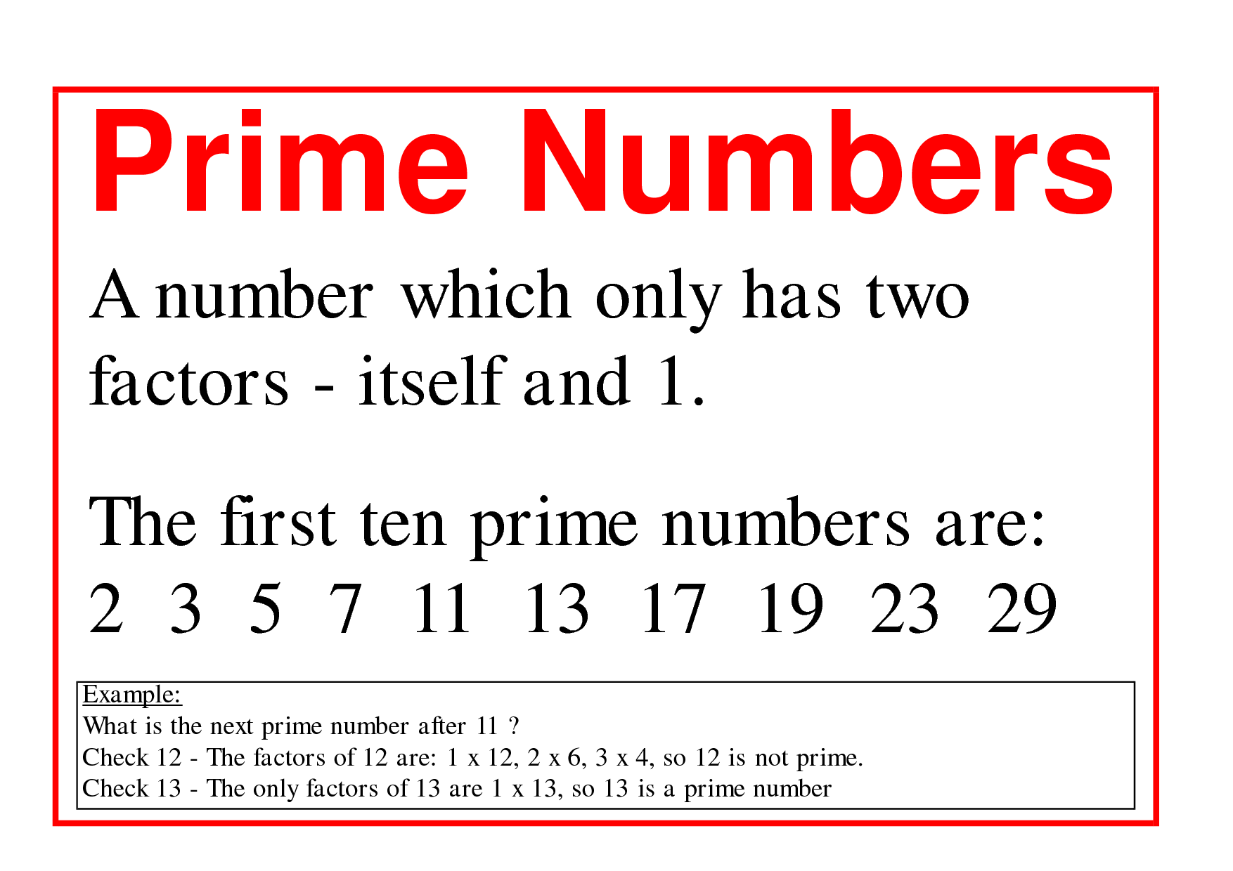 Prime Numbers Definition, Chart, Examples, and Practice Problems A Prime Number Definition illustrated definition of prime number: In other words, a prime number has exactly. a prime number is a natural number greater than 1 which has only two factors, 1 & the number itself. A whole number above 1 that can not be made by multiplying other whole numbers. For example, 5 is a. 19 is a prime number.. A Prime Number Definition.