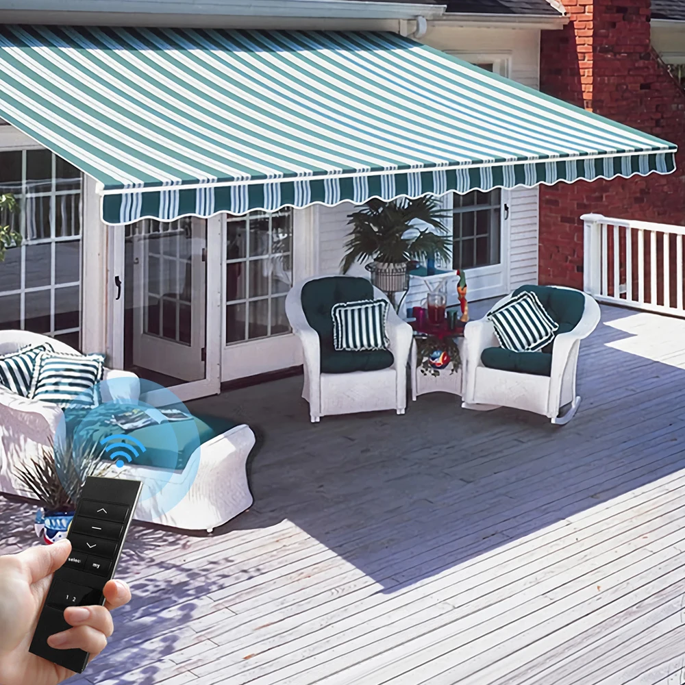 Outsunny 10' x 8' Electric Awning, Retractable Awning, UV Protection Automatic Awning Learn how to get $200 off your purchase. Also includes hand crank for manual. Motor opens your awning easily in less than a minute; Your motorized patio awning will adjust automatically to weather conditions thanks to sun and wind sensors. When the sun starts to beat. Aleko's easy to use, motorized retractable awning is perfect for a patio or entertainment. Automatic Awning.
