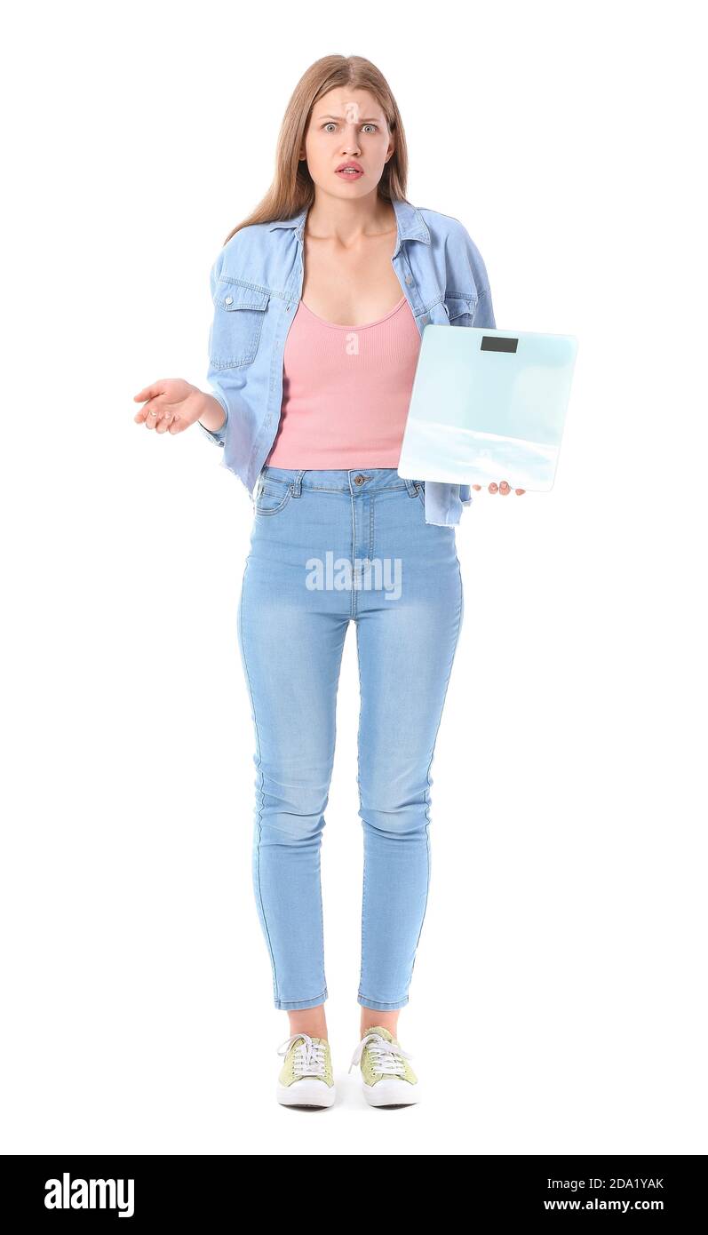 Woman with sudden weight loss problem on white background. Diabetes