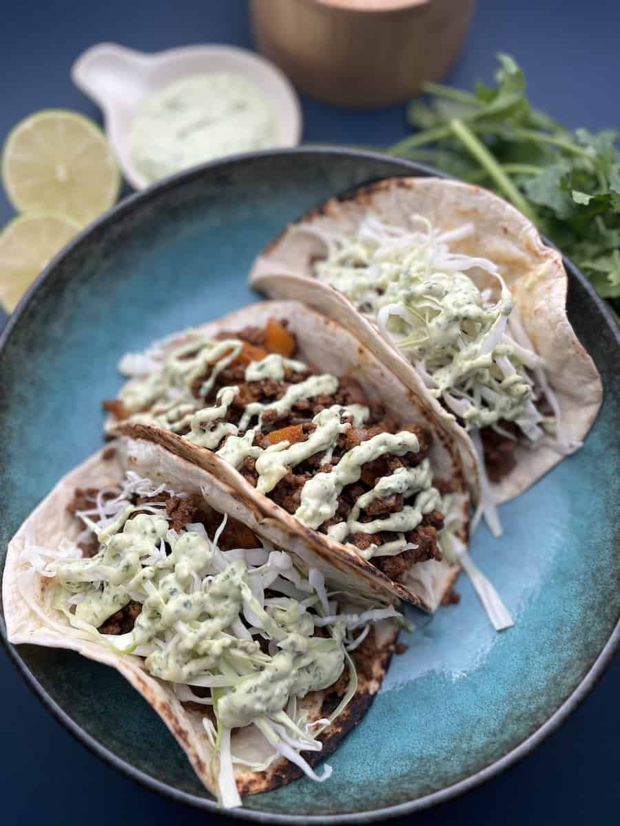 Ground Beef Tacos with Avocado Cilantro Aioli • Serious Food Crush