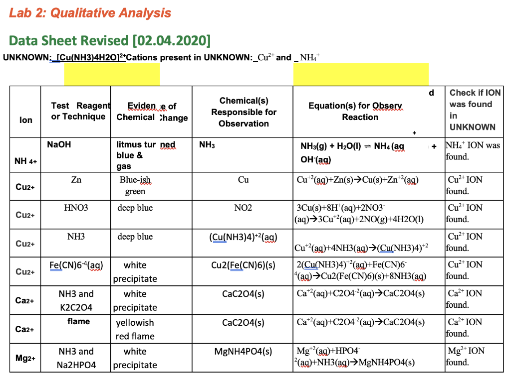 Solved Lab 2 Qualitative Analysis Data Sheet Revised Qualitative Analysis Chemistry Lab a common experimental method used to identify ions in a mixture is called qualitative analysis. testing for positive ions (cations) test for ammonium ion nh4 +, by reacting with warm naoh(aq) forming nh3. qualitative analysis is used to identify and separate cations and anions in a sample substance. with labsim, you can practice as in a. Qualitative Analysis Chemistry Lab.