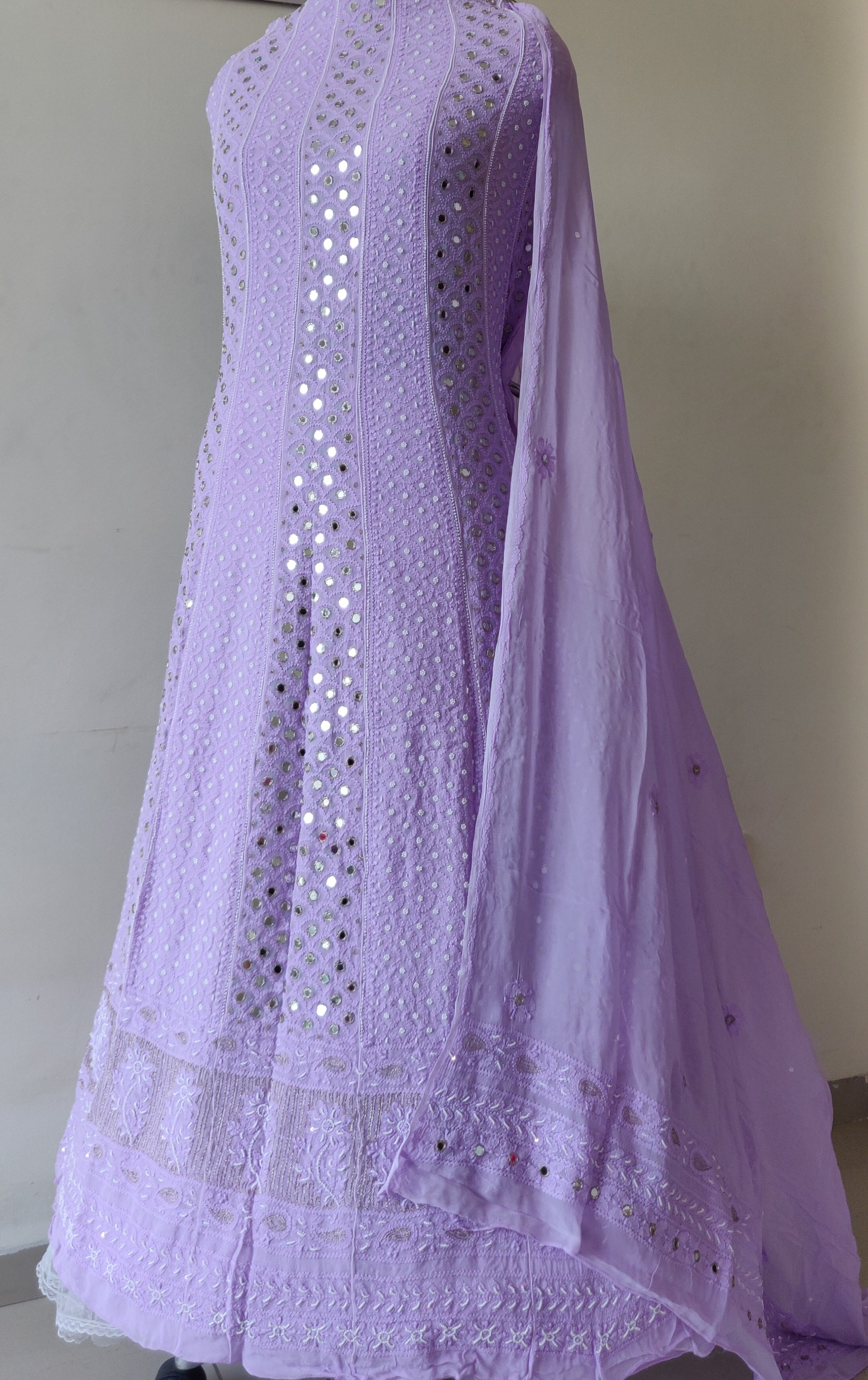 Lavender Chikankari and mirror work anarkali with dupatta