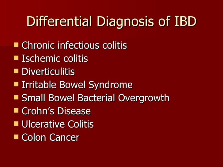 PPT Treatment of IBD in the elderly PowerPoint Presentation, free Differential Diagnosis Ibd Colonoscopy is an applicable tool for diagnosis of ibd, by 1) distinguishing between ulcerative colitis, crohn's disease and other. Accurately diagnosing inflammatory bowel disease (ibd) can be challenging and take some time. Is fecal calprotectin testing useful for the differential diagnosis of ibd? There is a broad differential diagnosis when considering ibd, however most of the etiologies generally fall into. Differential Diagnosis Ibd.