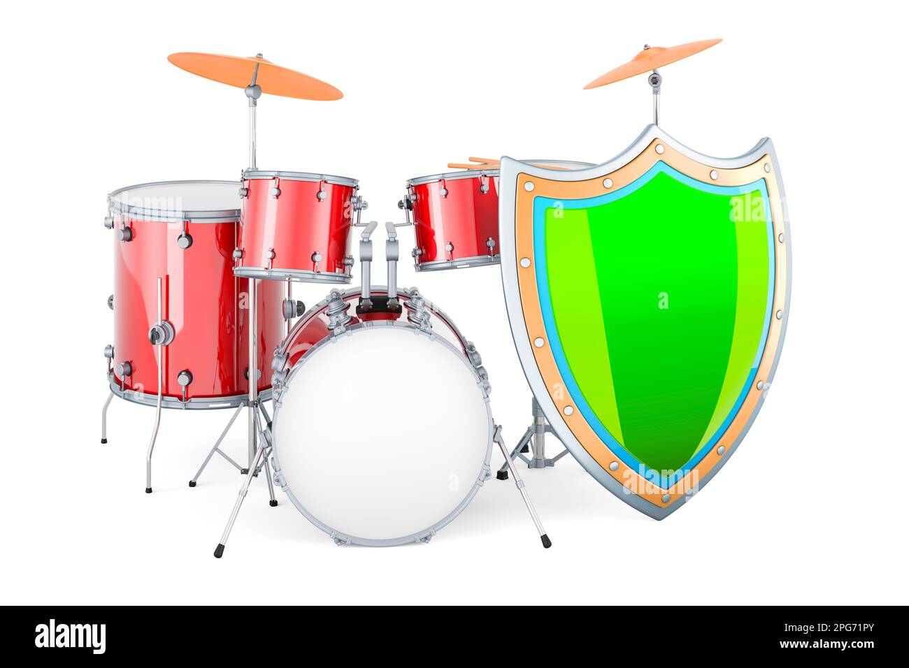 Drum kit with shield. 3D rendering isolated on white background Stock