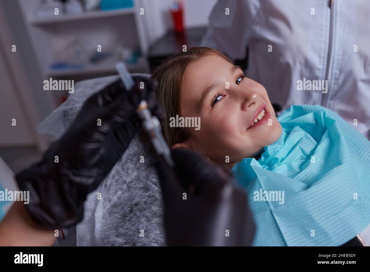 Little girl at dentist office, getting local anesthesia injection into