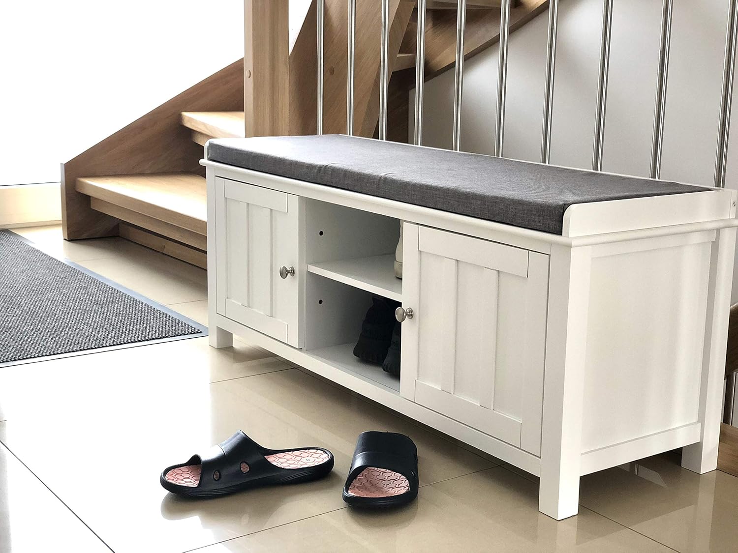 Sobuy Wooden Hallway Shoe Storage Bench White Fsr35-W . This modern shoe storage bench has a removable grey seat. The shoe cabinet cannot take up too much space while making good use of the space. Comfortable padded seat cushion is removable. The padded cushion which is removable. Modern design shoe rack, offering storage for shoes as well as extra seating space. [entryway bench with shoe storage]: Shoe racks with 1 flap for storing shoes on 2 levels. Modern design storage bench with 2 doors and seat cushion, good choice for hallway and living room. Two cubes with doors and storage compartment in middle with adjustable shelf provide large. Stylish shoe bench will blend perfectly.
