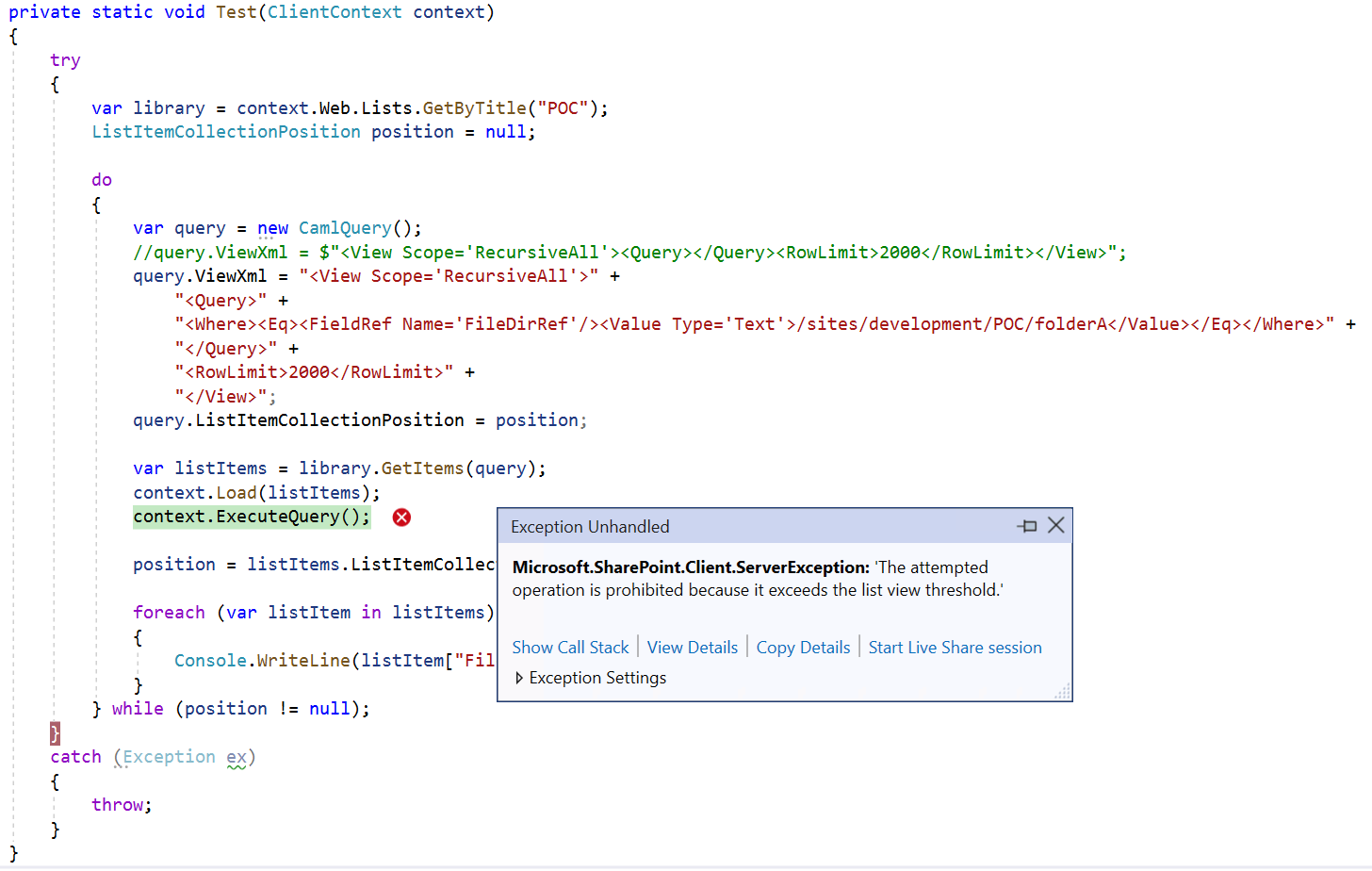 Sharepoint Online CSOM Large Library GetItems exception The attempted