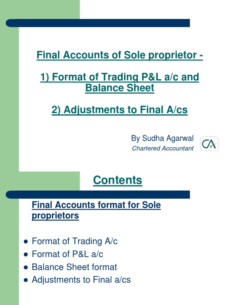 Final Accounts of Sole proprietor 1) Format of Trading P&L a/c and