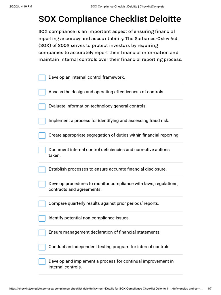 SOX Compliance Checklist Deloitte PDF Internal Control SarbanesOxley Act