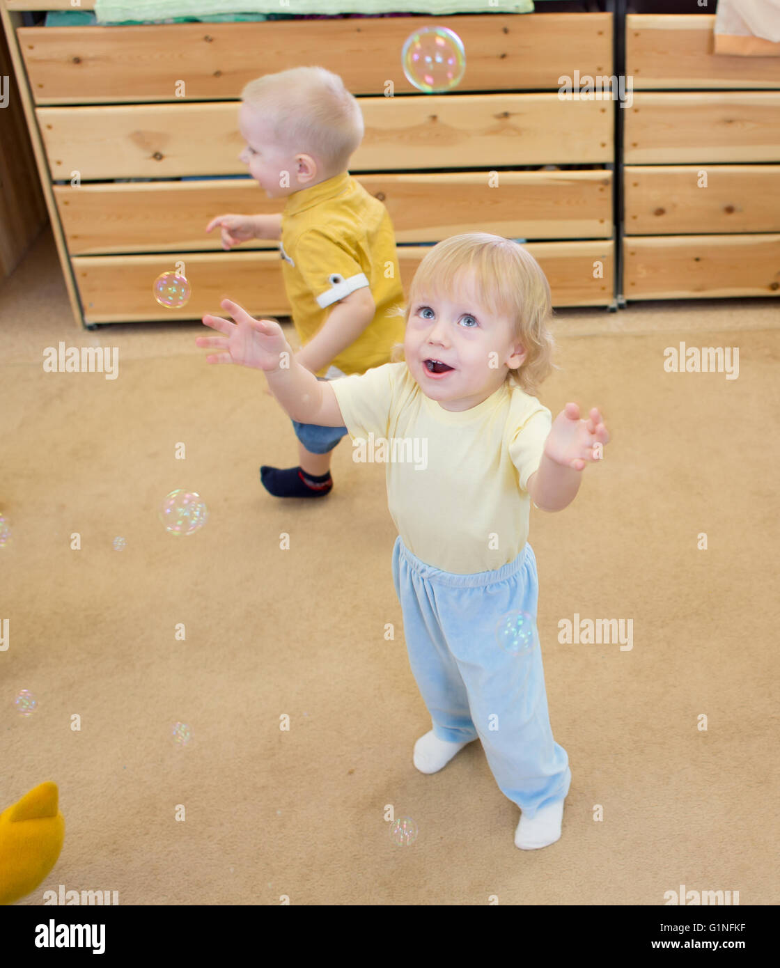 Children playing with soap bubbles in day care centre Stock Photo Alamy