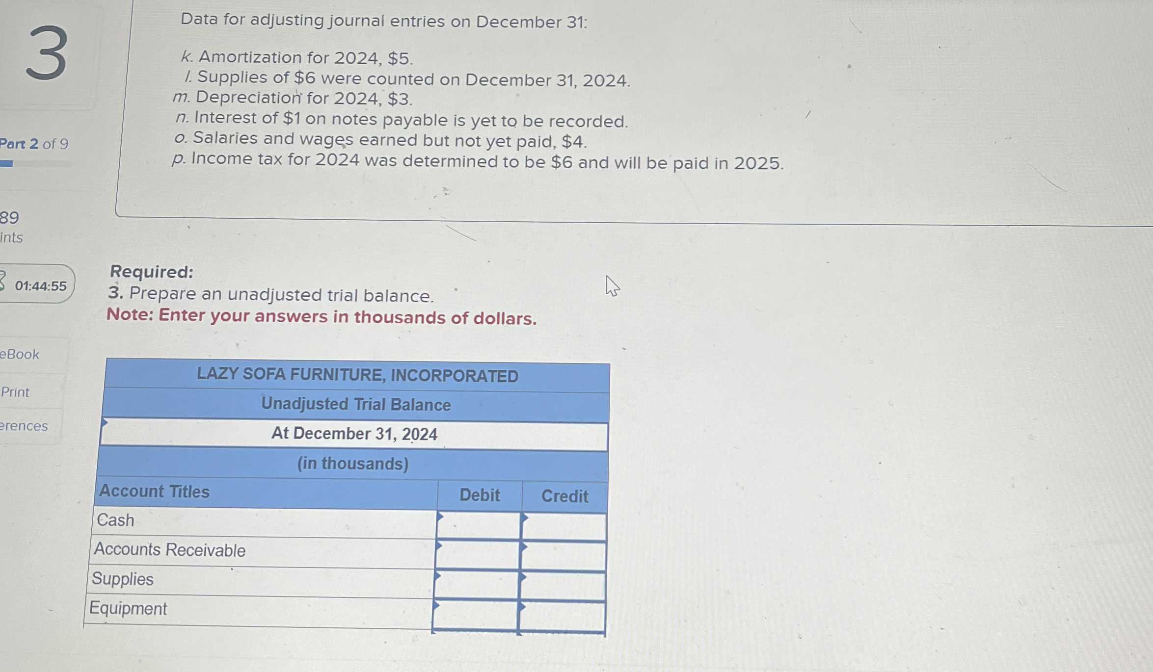 Solved Required information[The following information Is Furniture Debit Or Credit In Trial Balance trial balance only confirms that the total of all debit balances match the total of all credit balances. under the double entry bookkeeping method for every debit there should be a credit so a list of all the balances in the accounting records. since the owner’s equity’s normal balance is a credit balance, an expense must be. Is Furniture Debit Or Credit In Trial Balance.