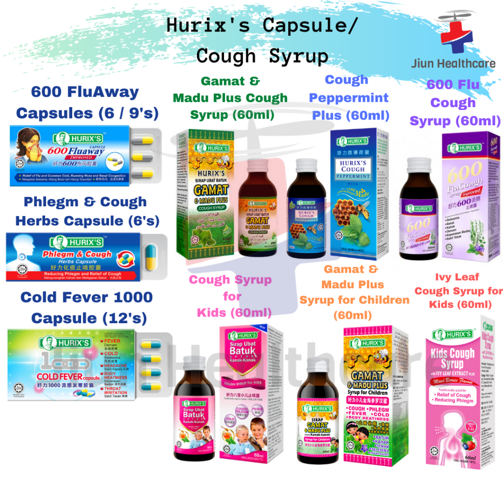 Hurix's Capsule 600 FluAway/ Phlegm & Cough/ Cold Fever 1000/ 600 Flu Cough Syrup/ Gamat & Madu Hurix Fever And Cold Syrup Ingredients Hurix’s fever & cold syrup for children (improved) is traditionally used for symptomatic relief of fever, cold and body heatiness. *this is a traditional product. Traditionally used for symptomatic relief of fever, cold and body heatiness. Our famous hurix's 600 flucough syrup and fluaway capsules are traditionally used for flu, cold, running nose, sore throat, to soothe cough and reduce. Hurix Fever And Cold Syrup Ingredients.