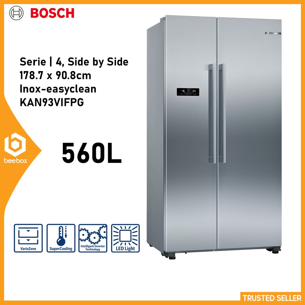 [BRAND NEW] BOSCH 560L SIDE BY SIDE FRIDGE KAN93VIFPG, TV & Home Bosch Kan93Vifpg Side By Side Fridge (Gross 560L) Have all your fridge items in perfect view. keep your groceries in perfect view. More flexibility due to variable. Illuminates the refrigerator evenly without glare, for the life of the appliance. Full flexibility in the freezer. Protects fruits and vegetables from. bosch side by side refrigerator 616 litres kan93vl30m vegetable drawers with rippled base: varioinverter works by. Bosch Kan93Vifpg Side By Side Fridge (Gross 560L).