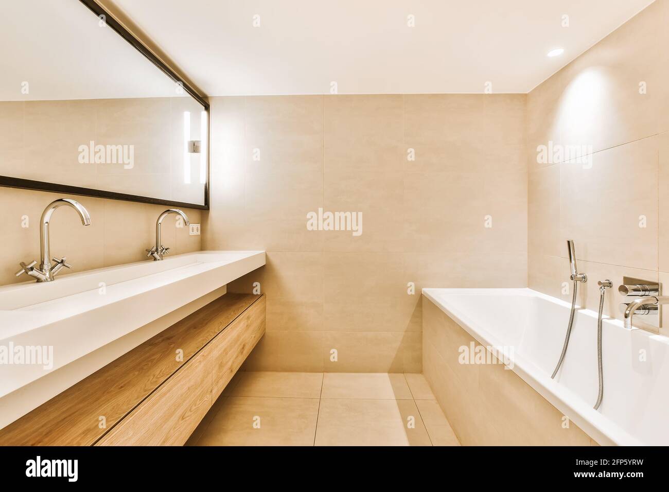 Beige tiled walls in bathroom with white double washbasin under mirror opposite to white tub