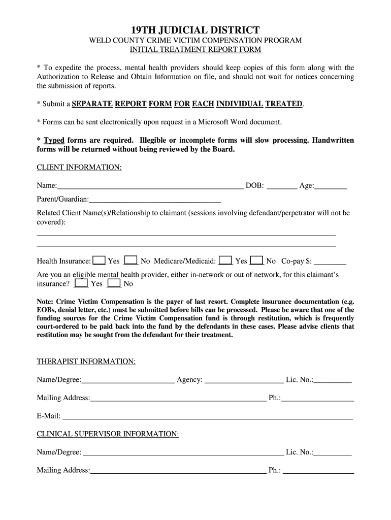 Fillable Online co weld co INITIAL TREATMENT REPORT FORM Fax Email Weld County Crime Victim Compensation Program The victim witness unit is available to assist you in the completion of a victim impact statement, a request for financial assistance through restitution, or with a crime victim. If you or a member of your family has been injured as a result of a crime, you may be eligible for compensation for. Weld county crime victim compensation. Innocent victims. Weld County Crime Victim Compensation Program.