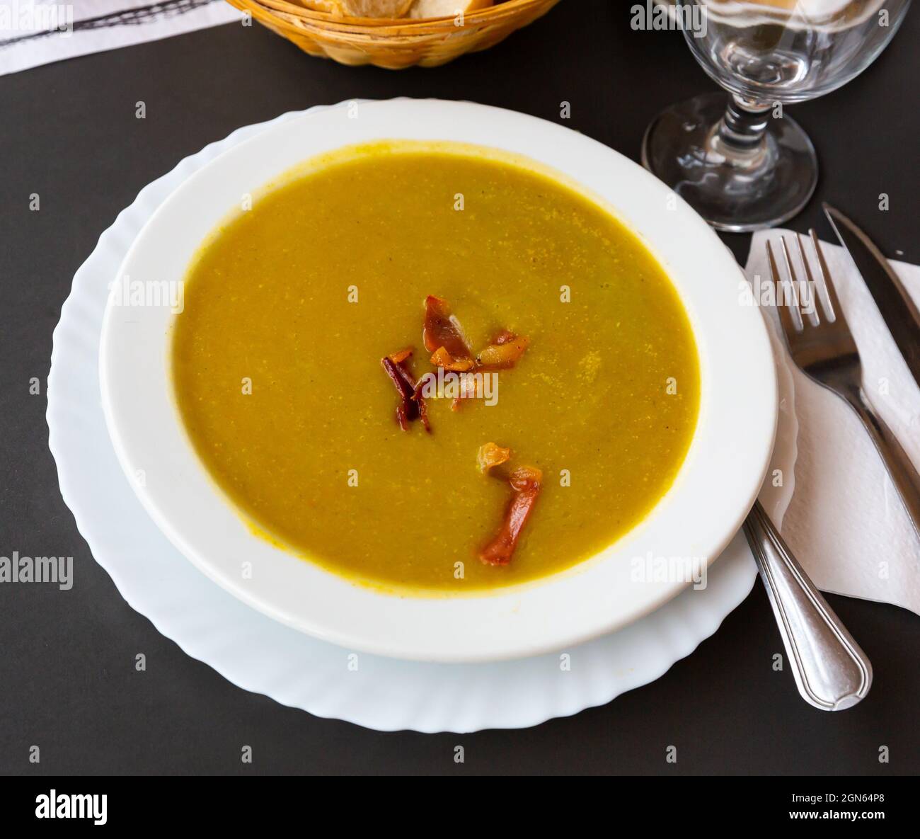Hearty vegetable soup puree with ham pieces Stock Photo Alamy