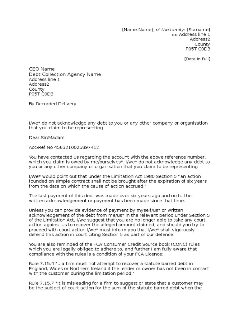 Statute Barred Debts Letter Template Collection Agency Debt