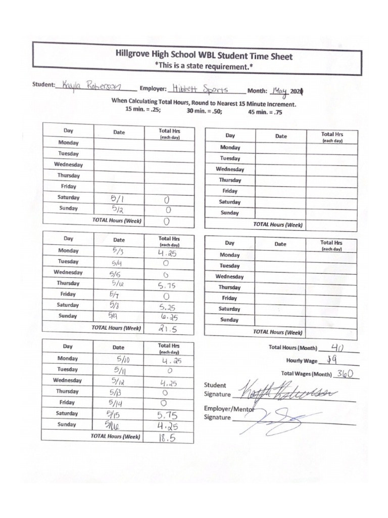 Hillgrove High School WBL Student Time Sheet 1 PDF