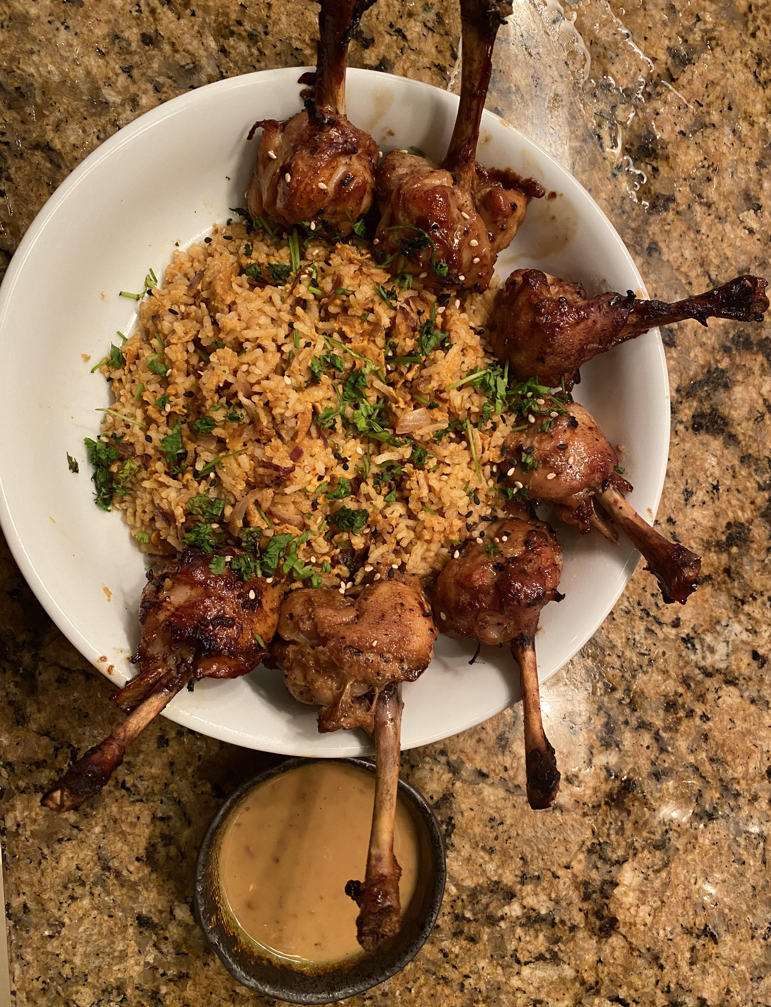 [Homemade] spicy chicken drumsticks with peanut sauce and egg fried rice r/food