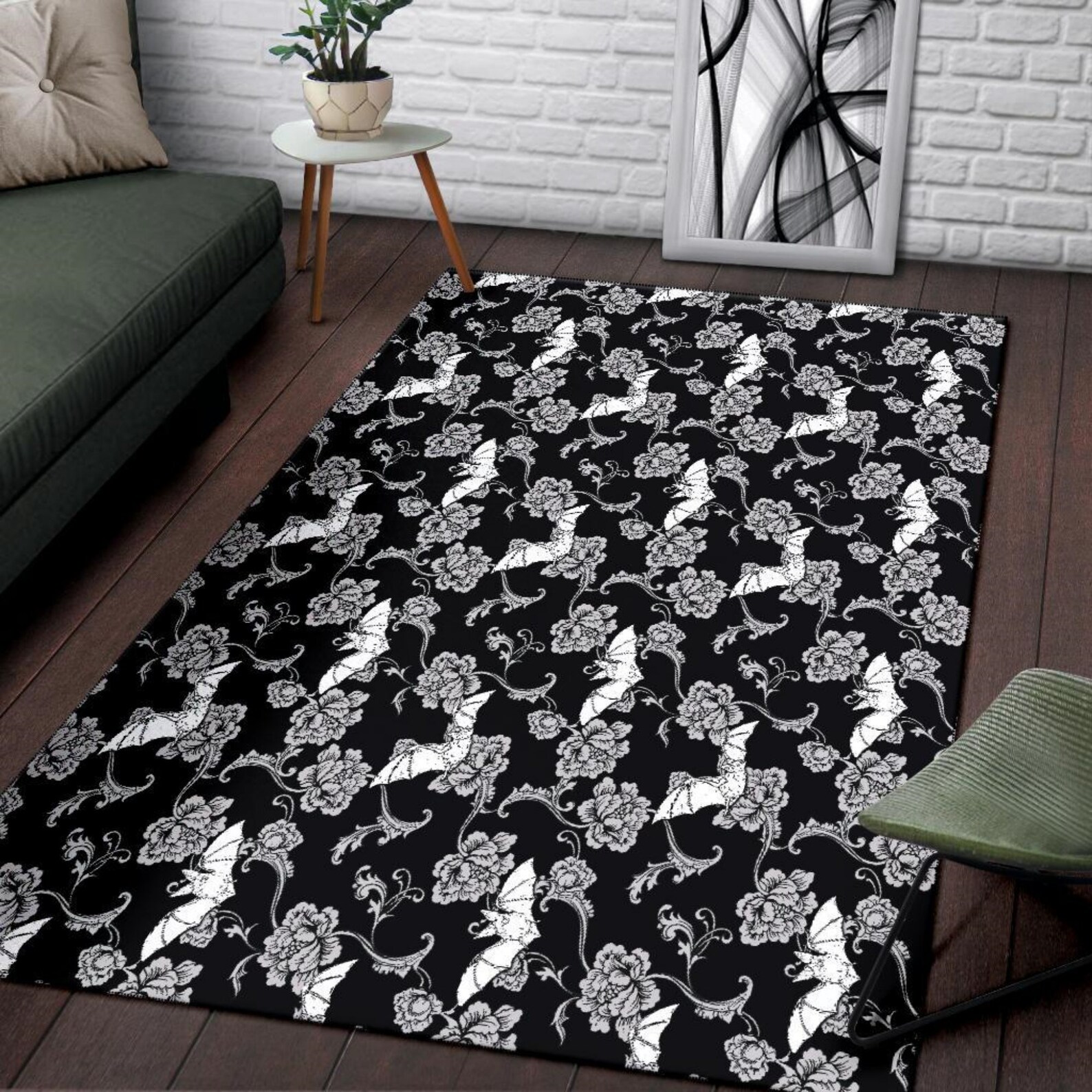 Floral Bats Black & White Area Rug Gothic Home Decor Goth Etsy